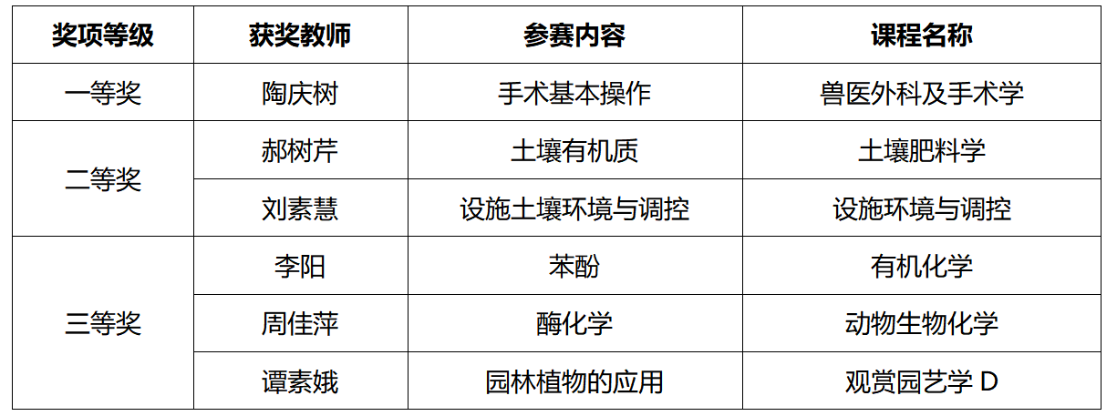 近日,我院教师在学校举办的首届“知农爱农”课程思政教学优秀教学设计中创造佳绩,获得一等奖1项、二等奖2项、三等奖3项。