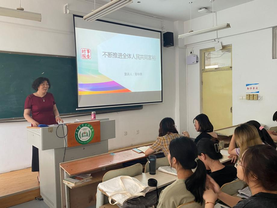 6月9日上午,校党委委员、宣传部长郑华美在齐河校区2号教学楼206教室,以“不断推进全体人民共同富裕”为题,为我院2020级园艺专业的同学们上了一堂形势与政策课。