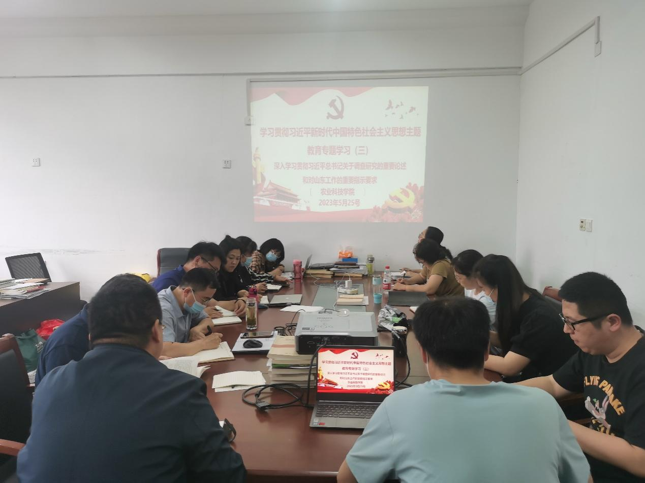 为把发现问题、研究问题、解决问题贯穿于主题教育始终,我院于5月25日下午济南校区3号教学楼206办公室、齐河校区教学楼229党员活动室同时开展“深入学习贯彻习近平总书记关于调查研究的重要论述和对山东工作的重要指示要求”专题学习活动。