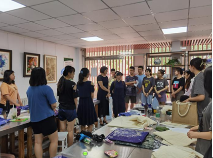 周老师主要是针对《手工印染艺术》课程中师生们遇到的困惑给予现场指导教学。首先,周老师与任课教师们进行了专业方面的交流,对教师们在教学过程中遇到的困难和问题给予相应的建议与解决方案,尤其是扎染、印染过程中的上色以及图案的成形、显色、固色等方面的实操环节提出了改良方案。随后,周老师亲自给学生们示范了印染艺术中最重要的一环,“快速建缸”,在操作步骤、用料配比及时间把控上作了详细的讲解说明,在周老师专业的指导下,学生们很快学会了方法并加以实践,作品的效果有了明显的改进。最后周老师耐心的解答了学生们在创作过程中的诸多问题,并在技法、构图,以及画面的粗细线条、疏密节奏的把握上给予专业指导。同时周老师也感慨,印染艺术创作过程有诸多不可控的因素影响作品效果,对艺术的感受力、领悟力也因人而异,适当保留自然而然产生的肌理感也不失一种新颖的表现方式,鼓励学生们大胆创新,勇于实践,积累经验。