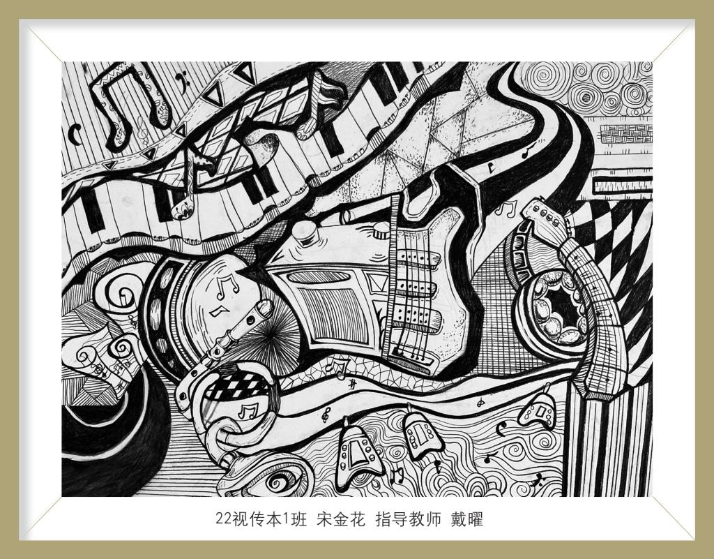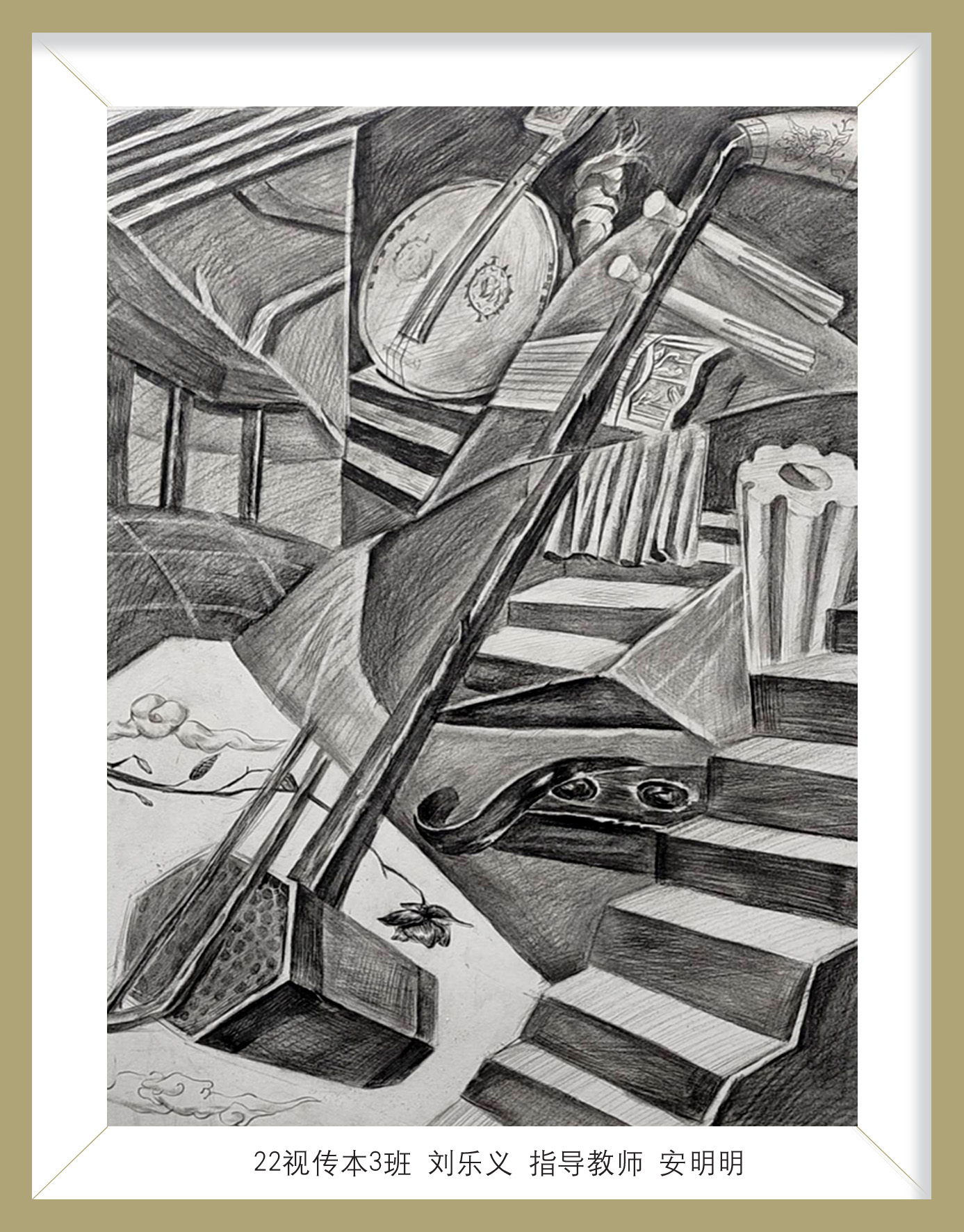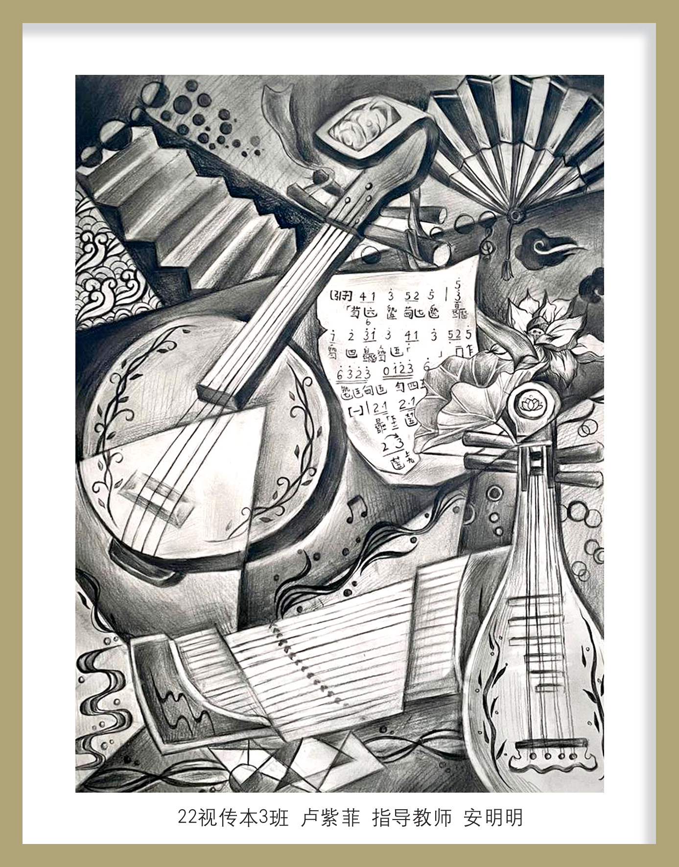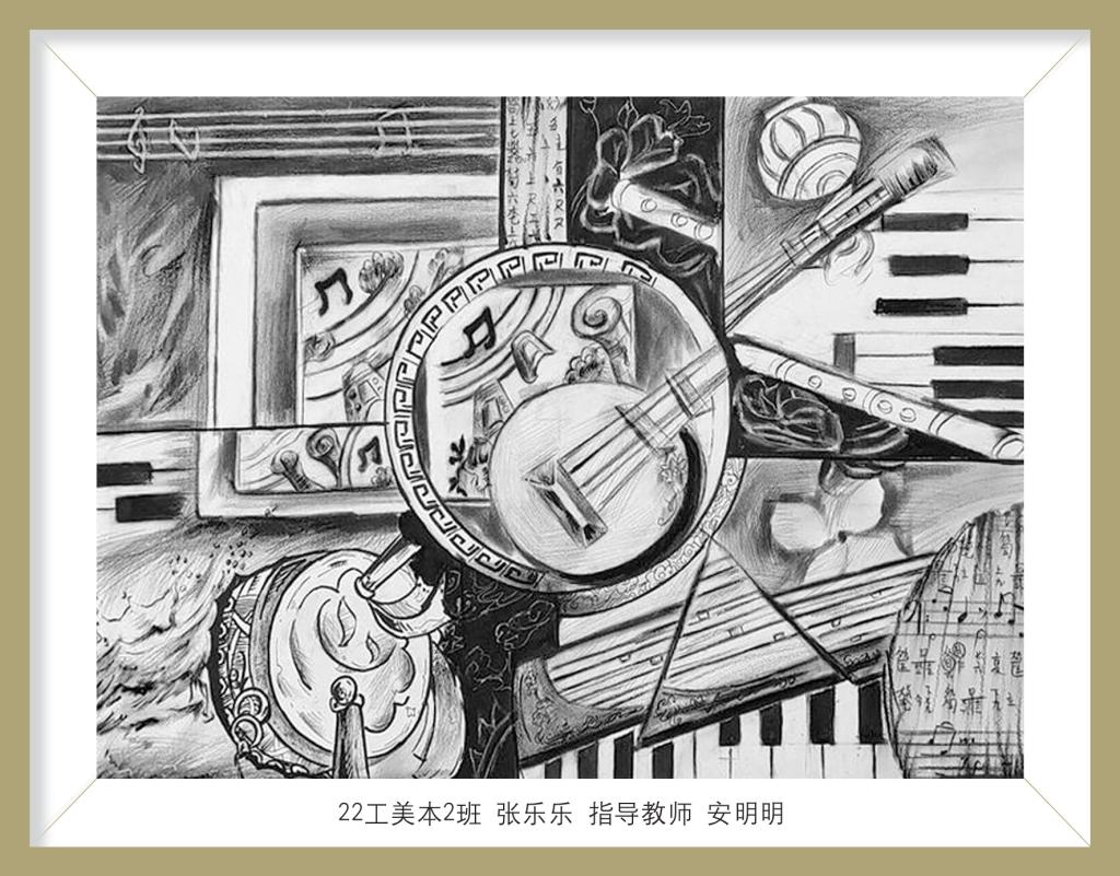 “综合创意素描训练”实训项目要求以“中国音乐”为主题,搜集相关元素(中国音乐符号、中国乐器、中国图形元素等)进行组合创意设计。要求学生综合运用各种造型设计方法进行大胆的创意设计表达,独立创作设计素描作品,以下展示的是部分学生优秀作品。