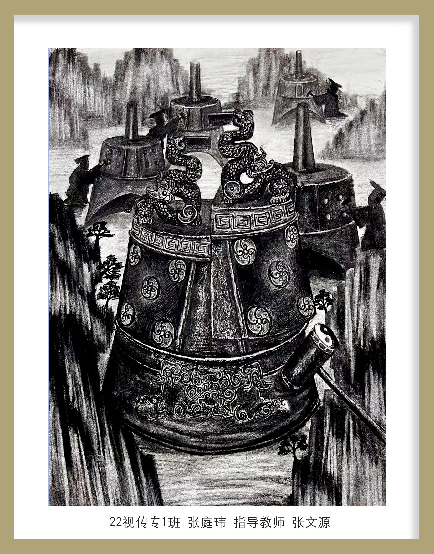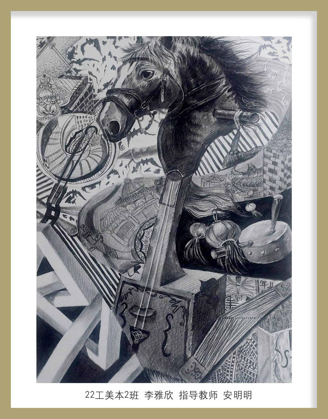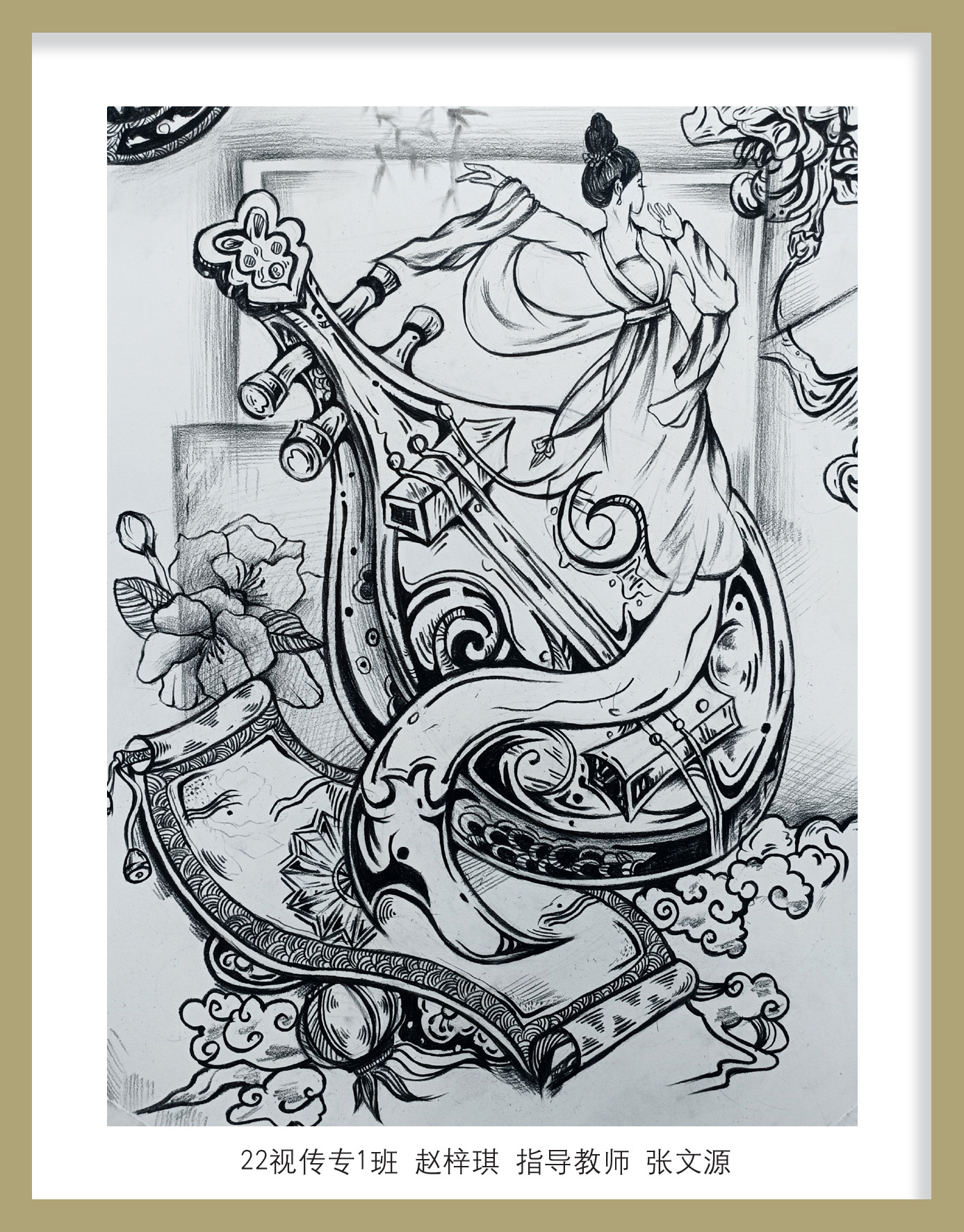 “综合创意素描训练”实训项目要求以“中国音乐”为主题,搜集相关元素(中国音乐符号、中国乐器、中国图形元素等)进行组合创意设计。要求学生综合运用各种造型设计方法进行大胆的创意设计表达,独立创作设计素描作品,以下展示的是部分学生优秀作品。