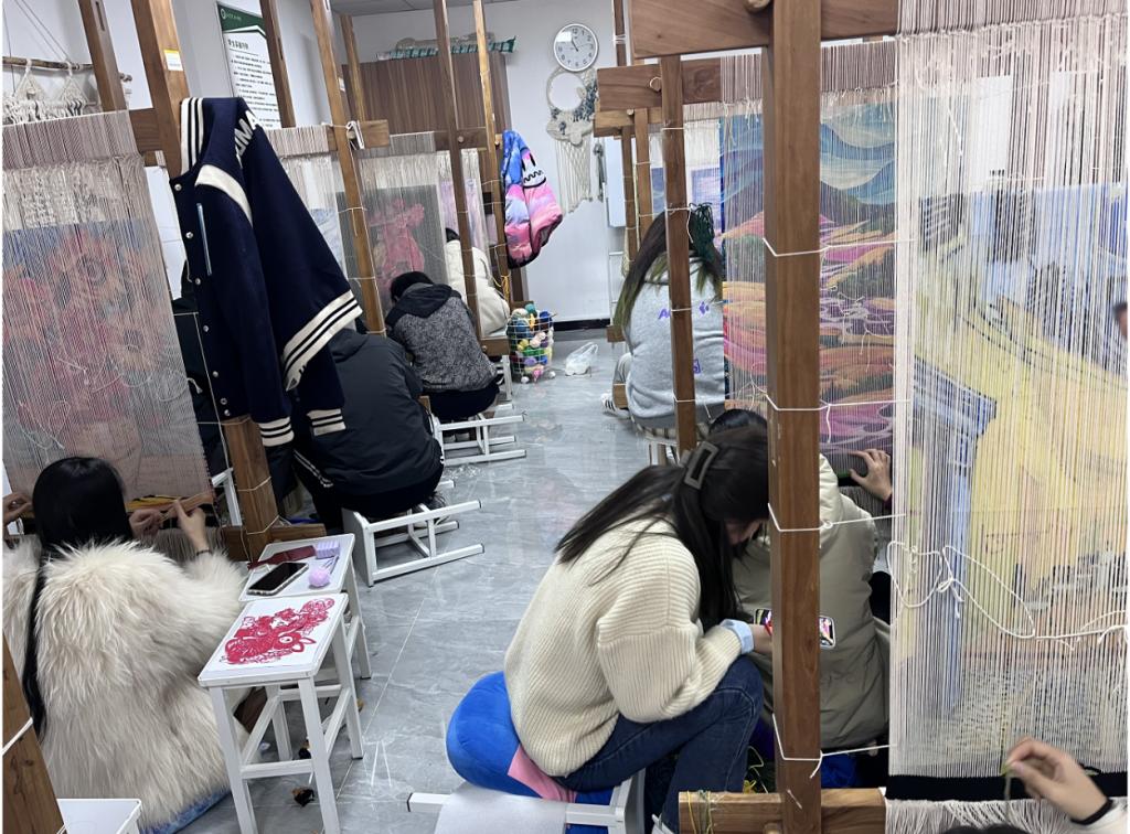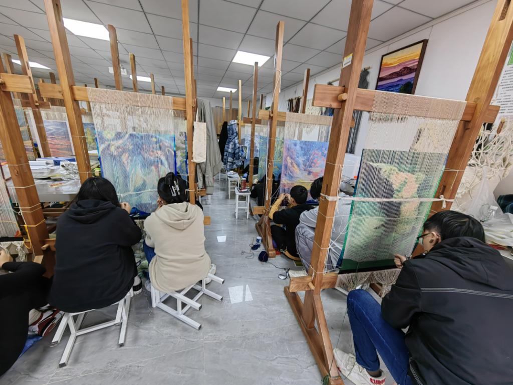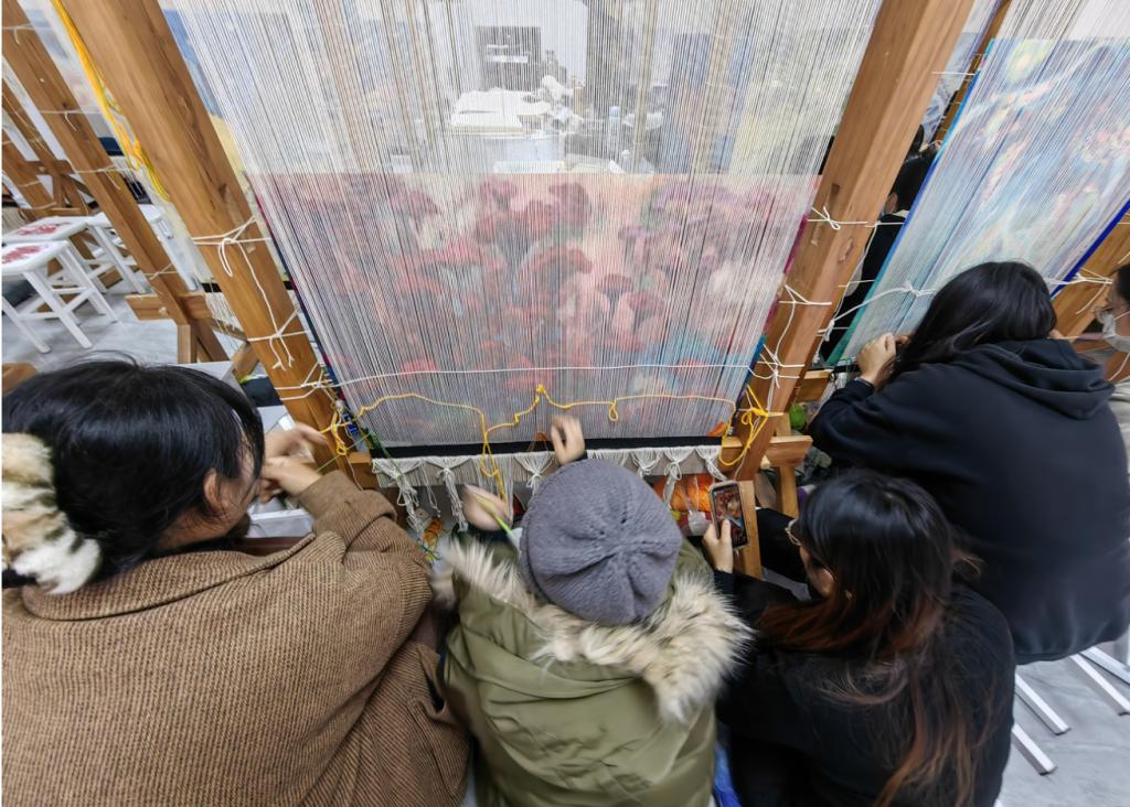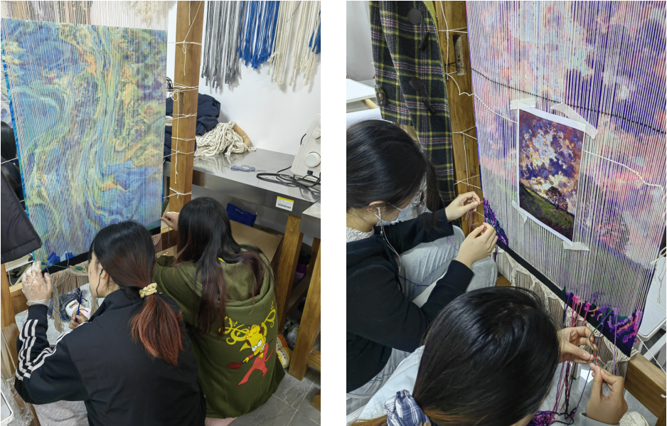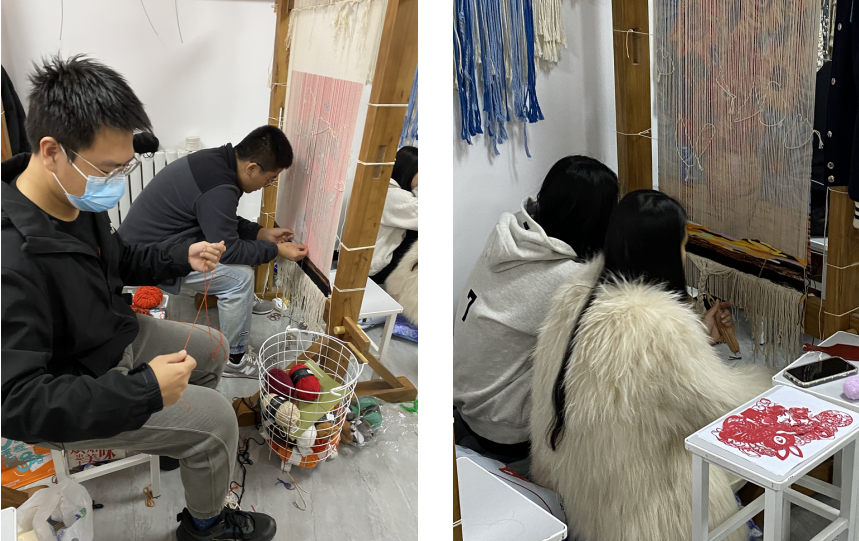 学生以2-3人为一组进行创作,充分锻炼学生的合作意识和团队协作能力。下图是学生进行初步编织的场景,学生们热情高涨、积极探索,期待他们通过传统工艺创作出体现现代元素的纤维艺术作品。(指导教师:隋燕、王郡娜、王煜莹)
