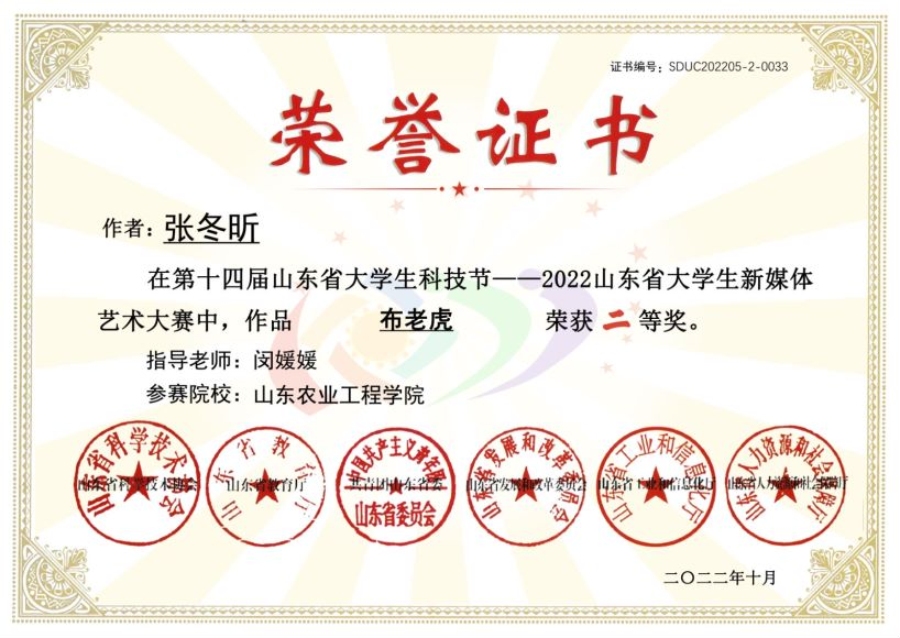 2022年山东省大学生新媒体艺术大赛,艺术学院视觉传达设计专业学生喜获佳绩,荣获一等奖1项、二等奖2项、三等奖1项,其中视觉传达设计专业学生亓雅洁作品《山东手造》荣获一等奖;张冬昕作品《布老虎》、田亚平作品《年画娃娃》荣获二等奖;刘洁作品《醉美汉字之纹饰中华》荣获三等奖。
