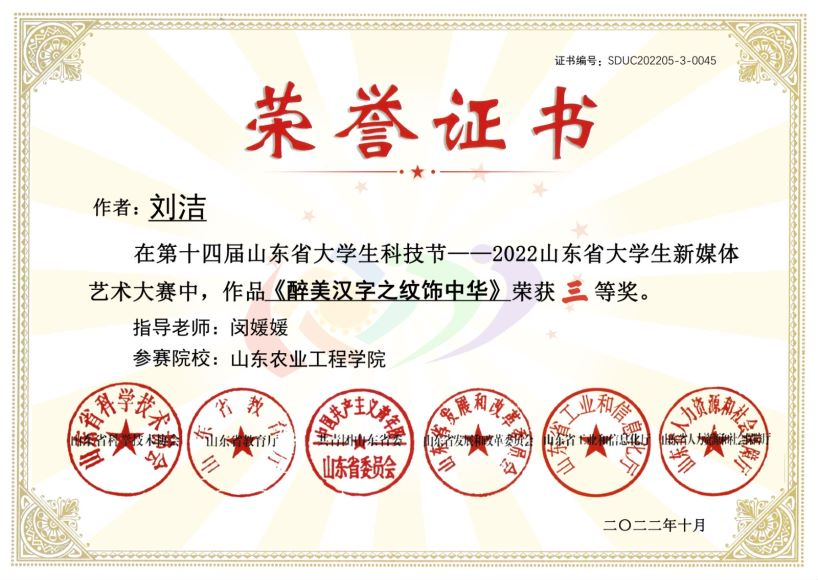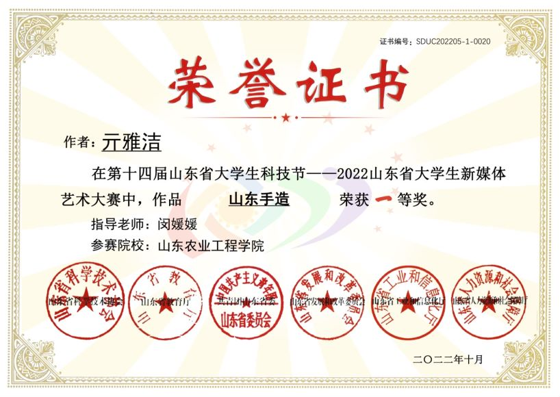 由山东省科协、山东省教育厅、团省委、山东省发展改革委、山东省工业和信息化厅、山东省人力资源和社会保障厅联合主办,山东省科普创作协会、山东工艺美术学院、中国海洋大学出版社有限公司承办的“第十四届山东省大学生科技节——2022年山东省大学生新媒体艺术大赛”以“中华传统造物观和造型体系”、“数字化赋能山东手造”为主题。参赛组别涵盖了界面设计和平面设计类、课程课件设计类、影像艺术类、互动设计和创意产品设计类以及创新创业类等多个项目。大赛自2022年4—6月启动并进行宣传工作,参赛作品琳琅满目,历时七个月的时间从众多参赛作品中共评出获奖作品619件,其中一等奖120件、二等奖200件,三等奖299件,优秀指导教师92名。