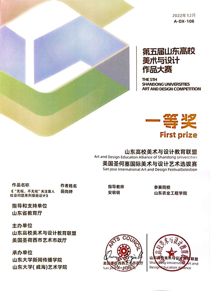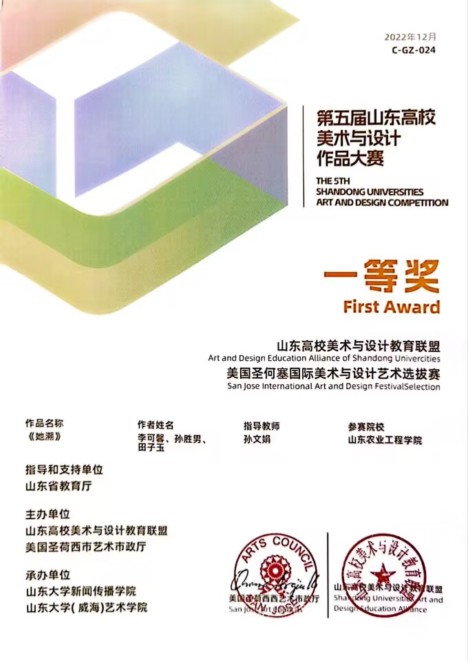 艺术学院学子在第五届山东高校美术与设计作品大赛中共荣获奖项52项,一等奖5项,二等奖15项,三等奖16项,优秀奖16项,其中安明明、魏向昕、李珏茹、孙文娟获优秀指导教师。