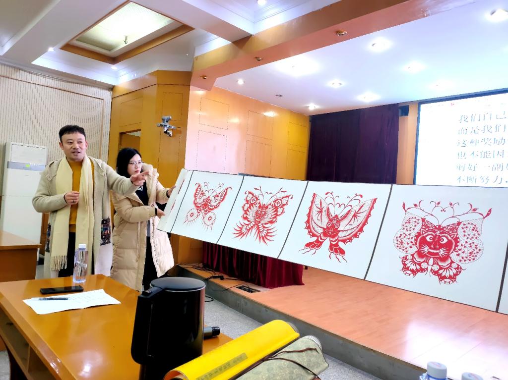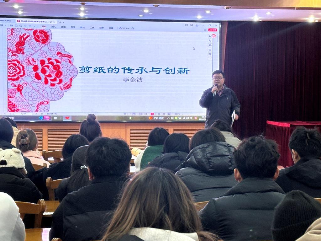 12月26日(周四)下午,在济南校区一号教学楼多功能厅艺术学院举办了一场非遗进校园的专题讲座。“国家级非物质文化遗产项目——高密剪纸”省级代表性传承人李金波先生应邀为师生们带来了一场关于剪纸艺术传承与创新的深度对话,讲座由学院副院长安明明主持。