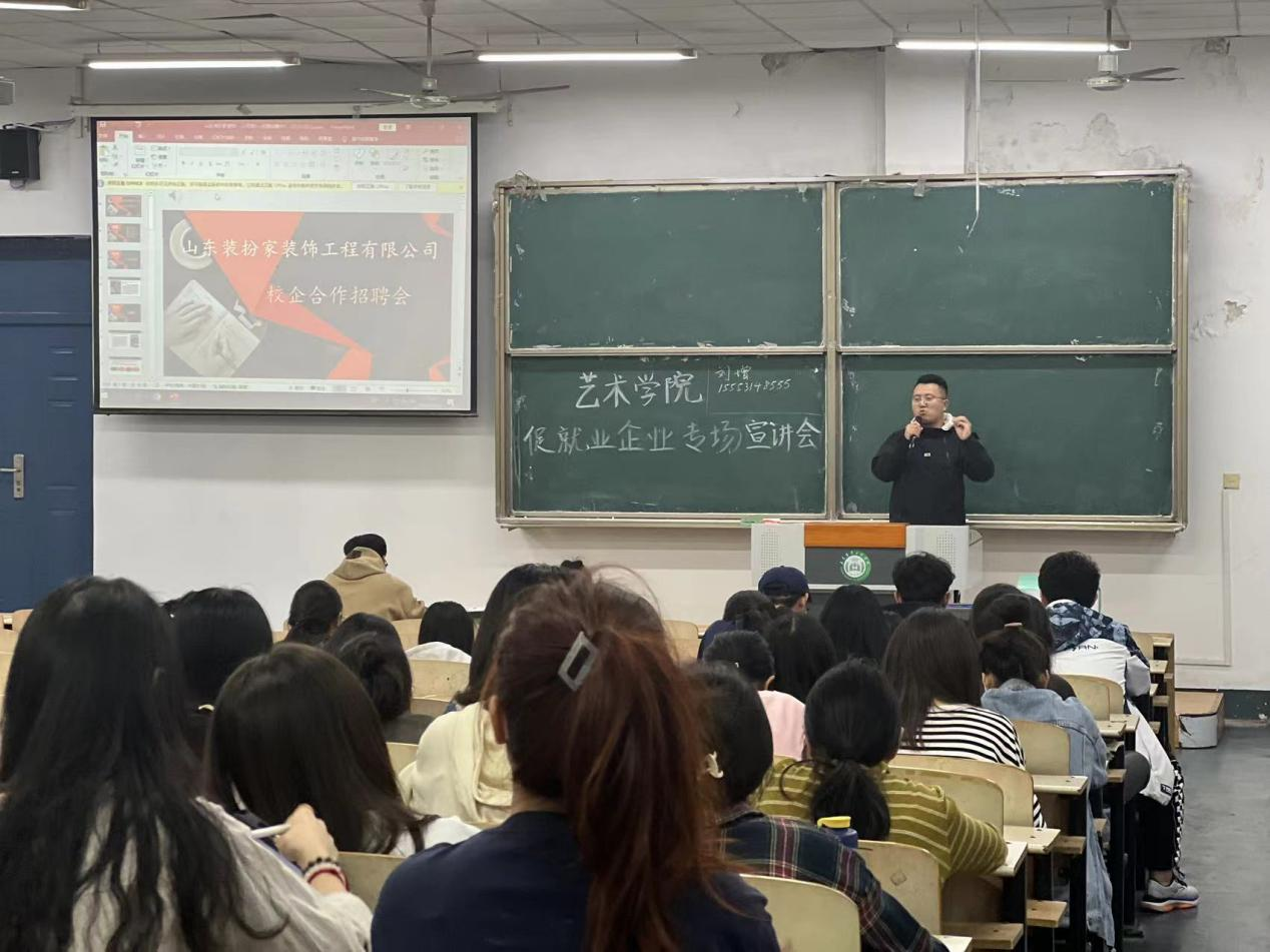 为做好艺术学院毕业生就业工作、推进对2024届毕业生就业的指导和帮助,也为加强校企沟通和协作,助力就业发展,2023年10月25日下午,艺术学院邀请山东装扮家装饰工程有限公司来校举办专场就业宣讲会,宣讲会地点位于学校东餐厅301教室,我院2024届视觉传达设计和环境艺术设计专业毕业生参与了此次宣讲会。