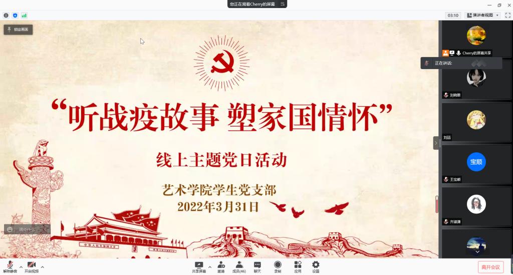 为贯彻落实党中央关于常态化疫情防控的决策部署,推进关于新冠疫情防控的工作要求,充分发挥高校基层党组织战斗堡垒作用和党员先锋模范作用,艺术学院学生党支部于2022年3月31日开展“听战疫故事,塑家国情怀”线上主题党日活动,通过党日活动传递积极向上的正能量,培育新时代青年的家国情怀。