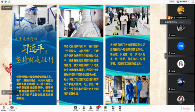 会上,钱玉翠同志先是带领与会党员学习传达习近平总书记重要讲话精神和有关疫情防控工作的最新部署,要求所有党员正确理解、积极配合、科学参与疫情防控,强调严格遵守学校相关规定,积极营造开展网络学习、健康生活的良好氛围,增强基层党组织的凝聚力、战斗力和影响力。随后会党员自行观看了《中国战疫录》纪录片,回顾了2020年抗击新冠肺炎疫情的过程,全国人民在党中央统一领导下,万众一心共战疫情,共产党员勇当先锋,用行动展现共产党人本色的优秀事迹。