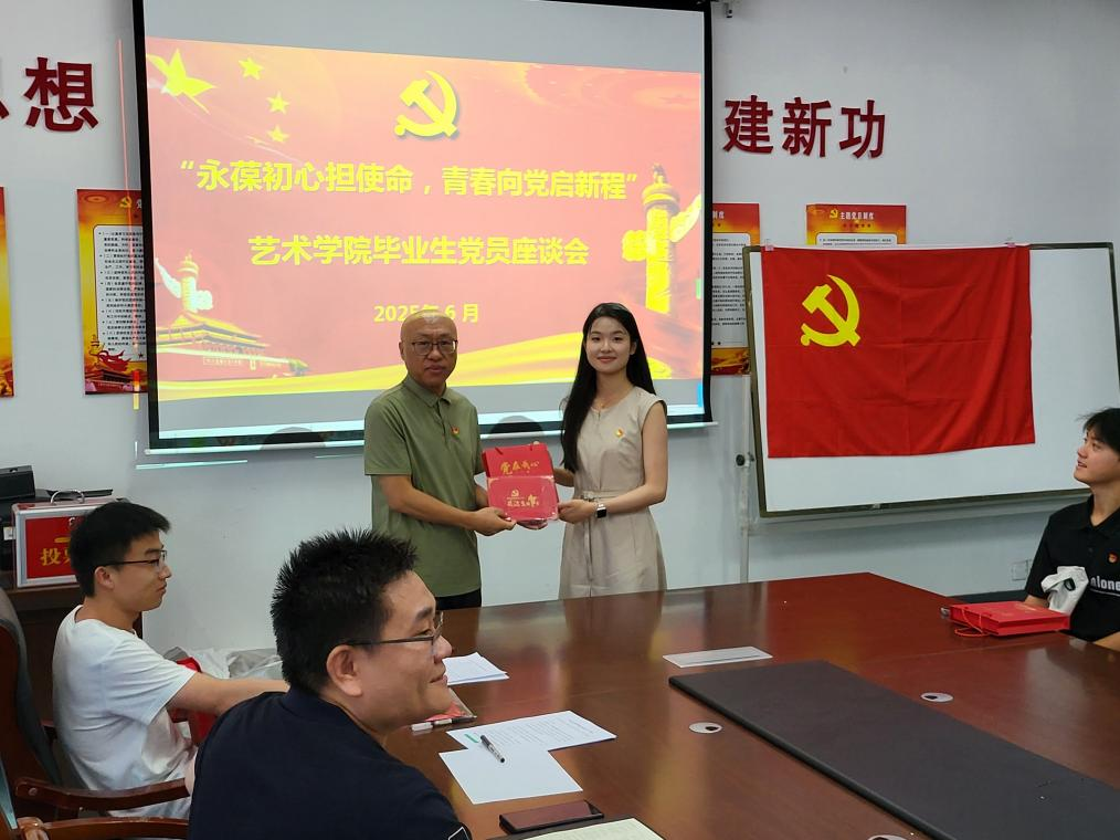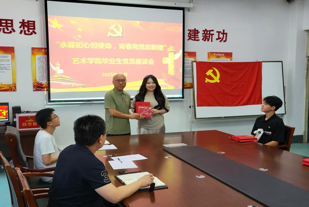 为进一步激励毕业生党员爱国爱党的热情,引导广大毕业生党员坚定理想信念,以饱满的热情踏上新征程,6月24日,艺术学院在1教108教室开展“永葆初心担使命,青春向党启新程”毕业生党员座谈会,艺术学院党总支副书记魏陵、专职组织员刘加、团总支书记马兴、辅导员秦建辉、张鹤以及2025届全体毕业生党员参加座谈会。