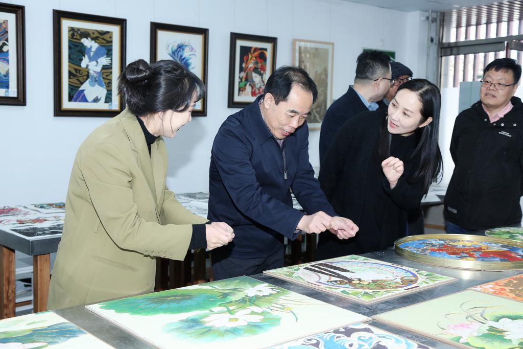 李校长首先对学院艺术实践教学中心进行实地考察,先后察看综合材料实验室、纤维艺术实验室、印刷实验室、陶艺实验室、印染实验室及优秀作品展室,详细询问各实验室开设实践项目情况,并对学生创作的各类工艺美术作品给予高度评价。