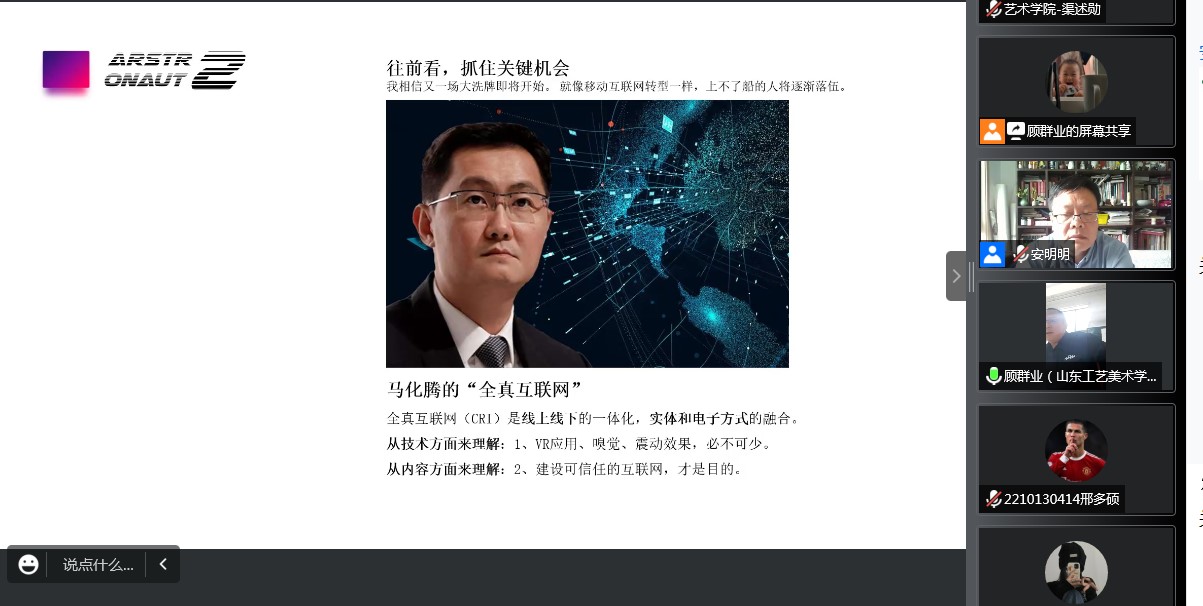 10月29日上午,山东工艺美术学院教授、博士生导师、新媒体艺术家顾群业教授应邀为我院师生进行了一场别开生面的学术讲座。本次讲座主题为《再提虚拟虚拟——从数字孪生到元宇宙》,以腾讯会议的形式进行,艺术学院部分师生及数字媒体艺术专业的全体师生聆听了本次讲座。