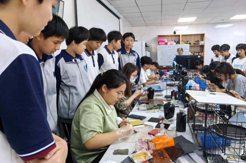 为迎接“全国科普日”的到来,我院积极开展了为期一周的服务学校周边社区的科普活动。本次活动的主题是“山东出好品,匠心传千年”,邀请了济南历城双语实验学校的师生走进校园,参观艺术学院工艺美术系列实验室,为他们科普山东手造工艺品的传承、技艺等科学知识。