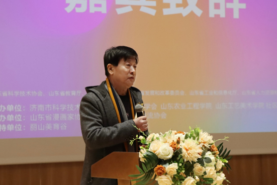 中国美术家协会漫画艺委会主任、山东漫画家协会主席陈黎青发表讲话。他从艺术创作的角度,与学生们分享创作心得,对青年学生和动漫从业者提出要求和期许。他认为,漫画艺术不同于其他画种,要深入观察和感悟生活,思想性和艺术性相得益彰,才能赋予漫画作品无限的生命力。漫画内容从生活中来,要符合生活的规律,但又必须高于生活,同时还具有哲理性、幽默性、趣味性。好的漫画作品属于意料之外,却在情理之中,除了要有深厚的幽默感,还必须蕴含强烈的社会责任感。