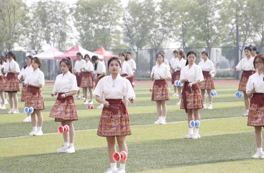 由我院学子组成的百人空竹表演方队,小小空竹划破天际,在运动场上大放光彩,精彩的表演,赢得现场观众的阵阵掌声。