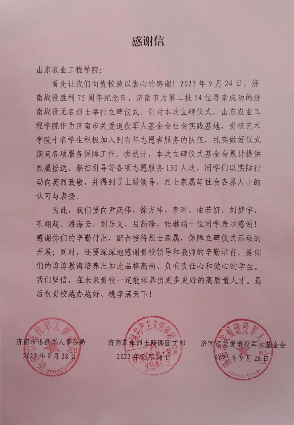 最近,学院收到了一封来自济南市退役军人事务局的感谢信。信中写道,我院学生尹庆伟、徐方祎、李珂、曲若妍、刘梦宇、孔翊超、潘海云、刘乐义、吕高锋、张琳婧积极加入到青年志愿队伍,扎实做好各项服务保障工作。同学们以实际行动向英烈致敬,受到了高度的认可与赞扬,为此诚挚的感谢学校和学院的辛勤教导和培养。