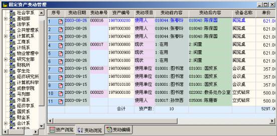 固定资产在使用过程中可能会发生某些属性的变化,变动管理对使用单位、使用人、使用方向、存放地点、现状、单价等信息项进入变动,另外可以增减附件,资产的其他信息不能通过固定资产变动 来进入修改系统会跟踪并记录下每一件资产从购置后到平时使用状态的变化,到最后报废(或丢失或调出)的整个生命周期。