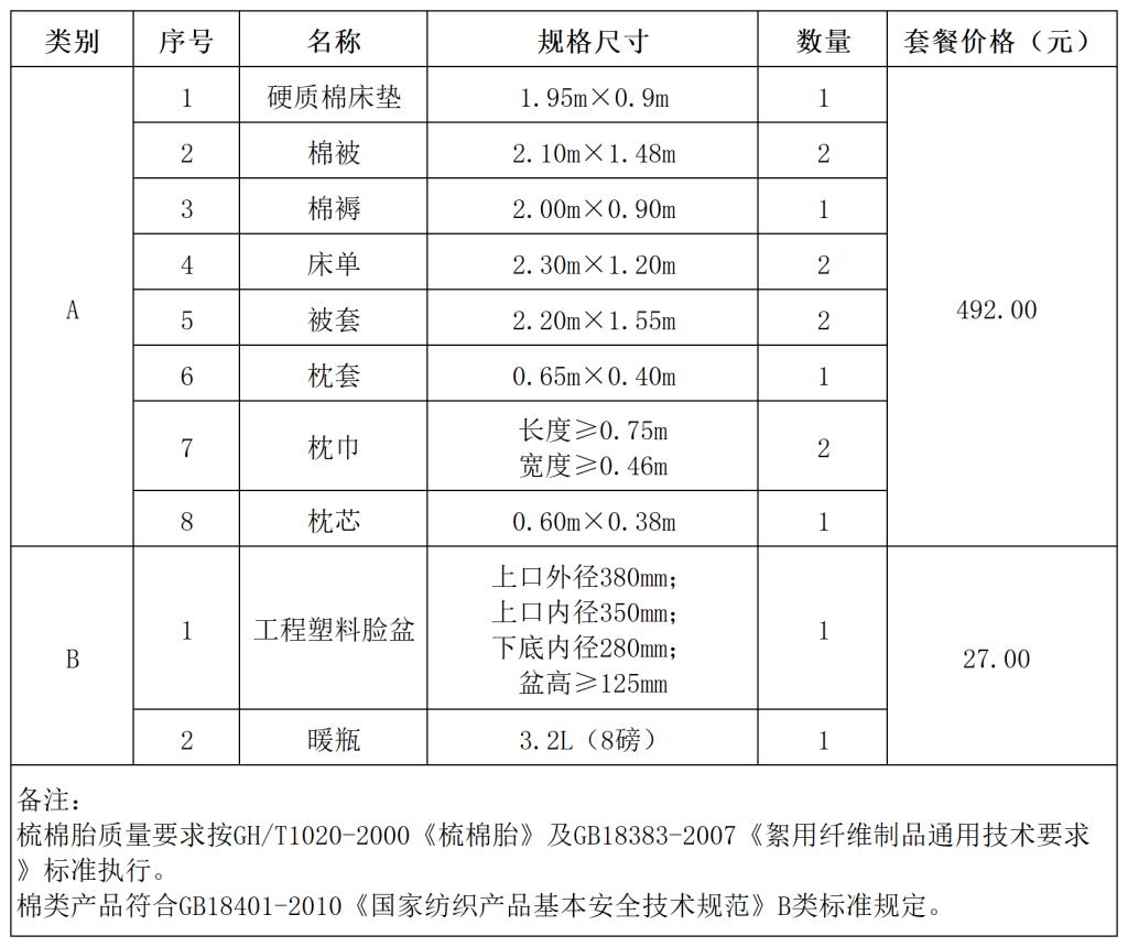 公寓床上用品分为A、B两项,可选择两项同时购买,也可选择其中一项购买。不愿购买者请按照学校提供的尺寸自行携带质量合格公寓用品。自带床上用品的学生,入学时需进行登记备案。