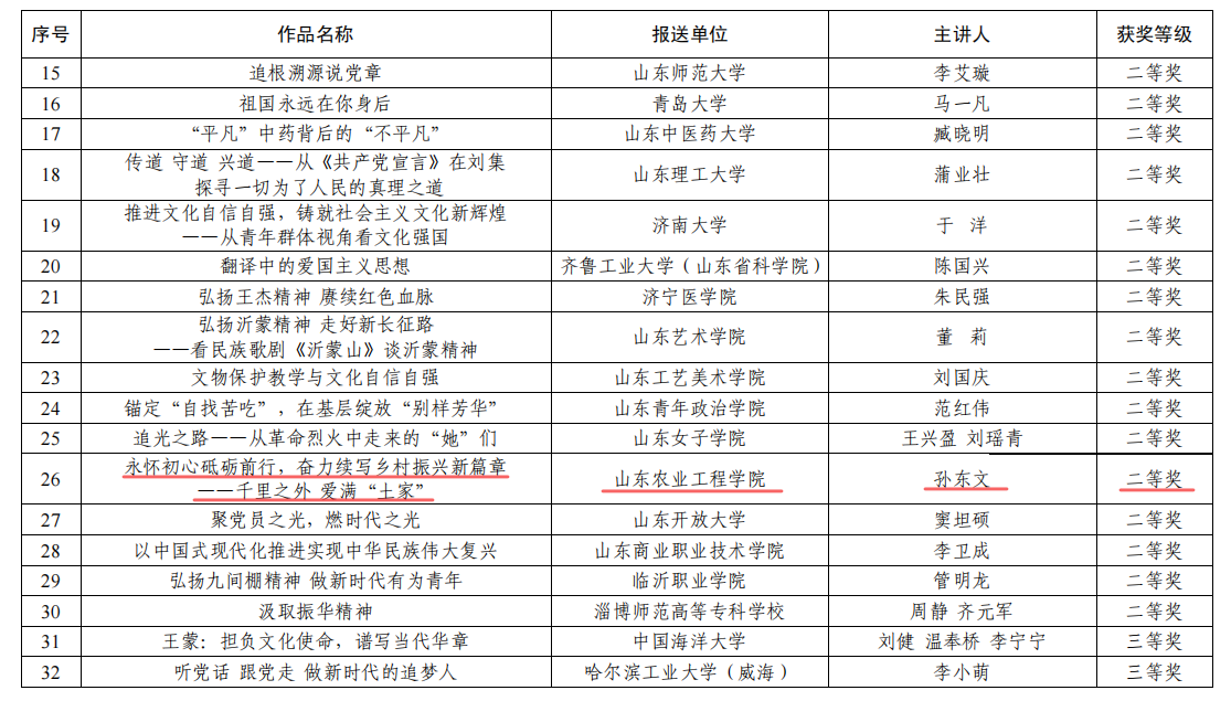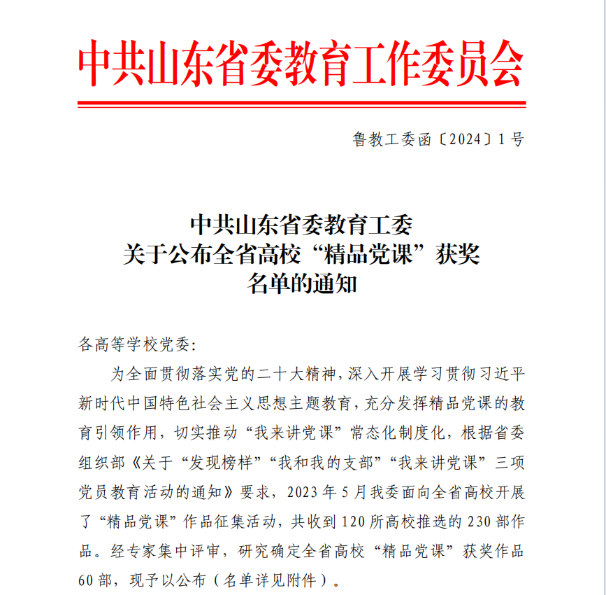 近日,中共山东省委教育工委公布了全省高校“精品党课”获奖名单,今年会食品科学与工程学院教工第二党支部书记孙东文同志主讲的党课《永怀初心砥砺前行,奋力续写乡村振兴新篇章——千里之外 爱满“土家”》获得全省二等奖。